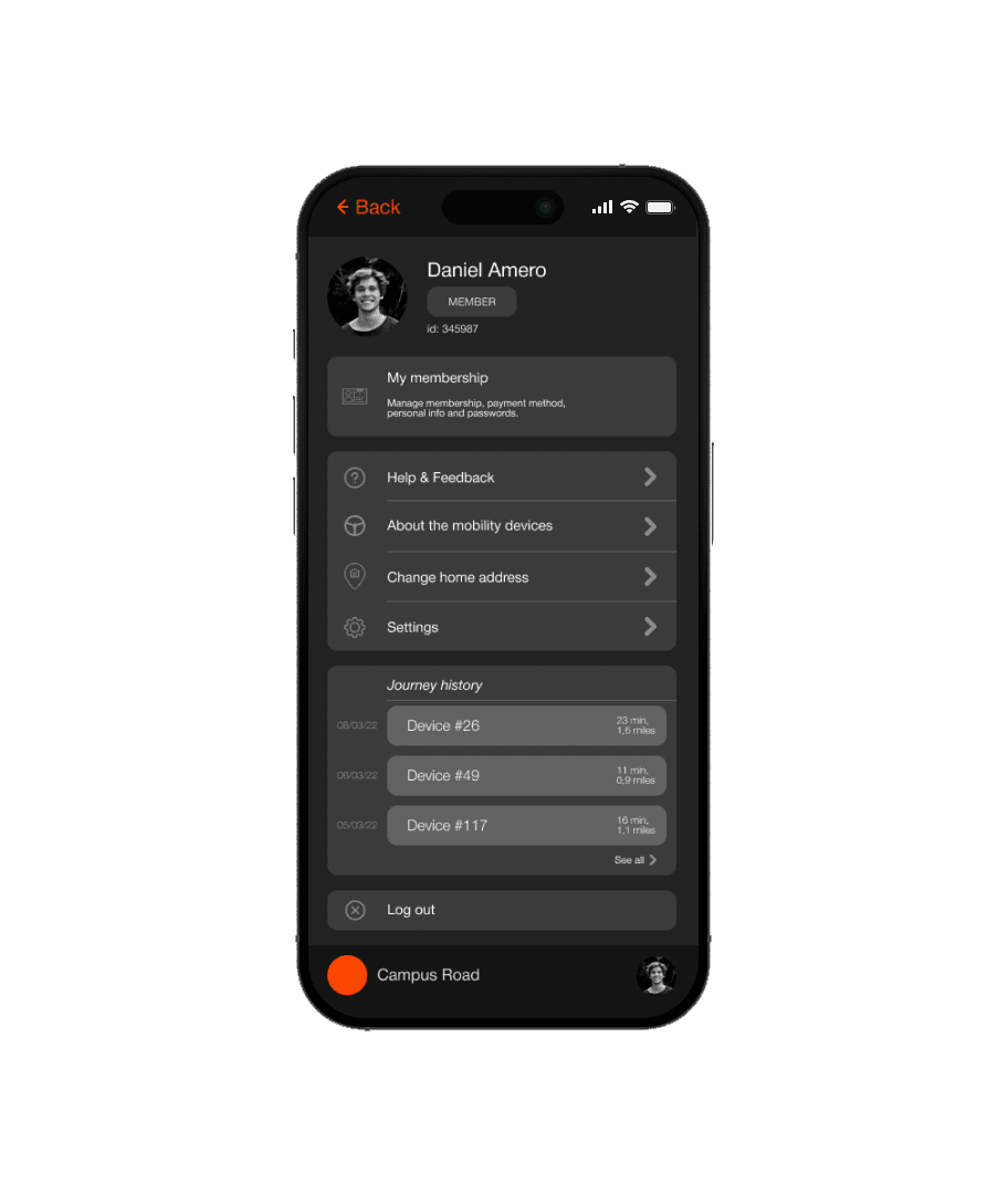 The app provides ArtCenter students with seamless access to rentable mobility scooters at designated campus locations. Students can use these scooters to travel home and conveniently return them upon arriving back at campus.
