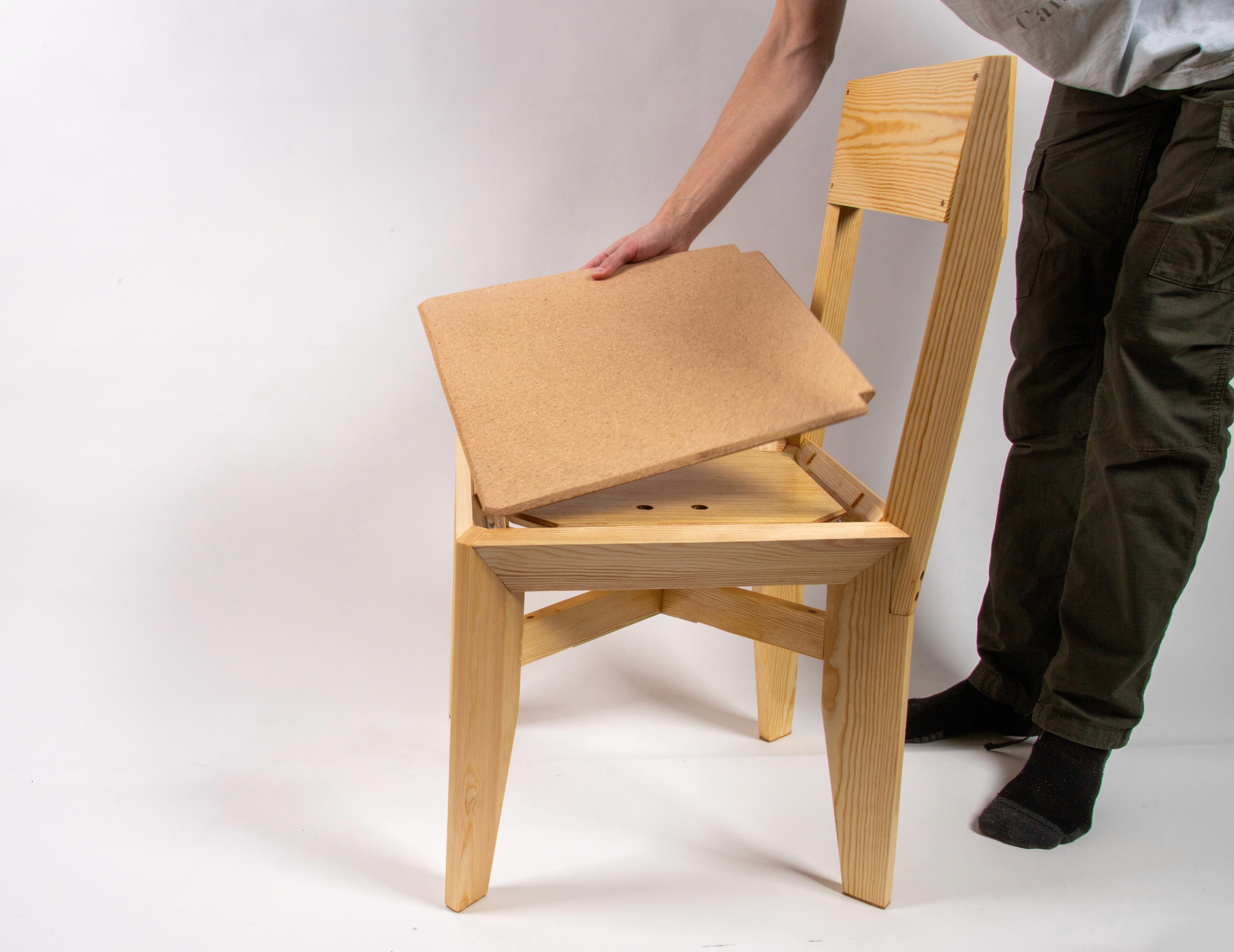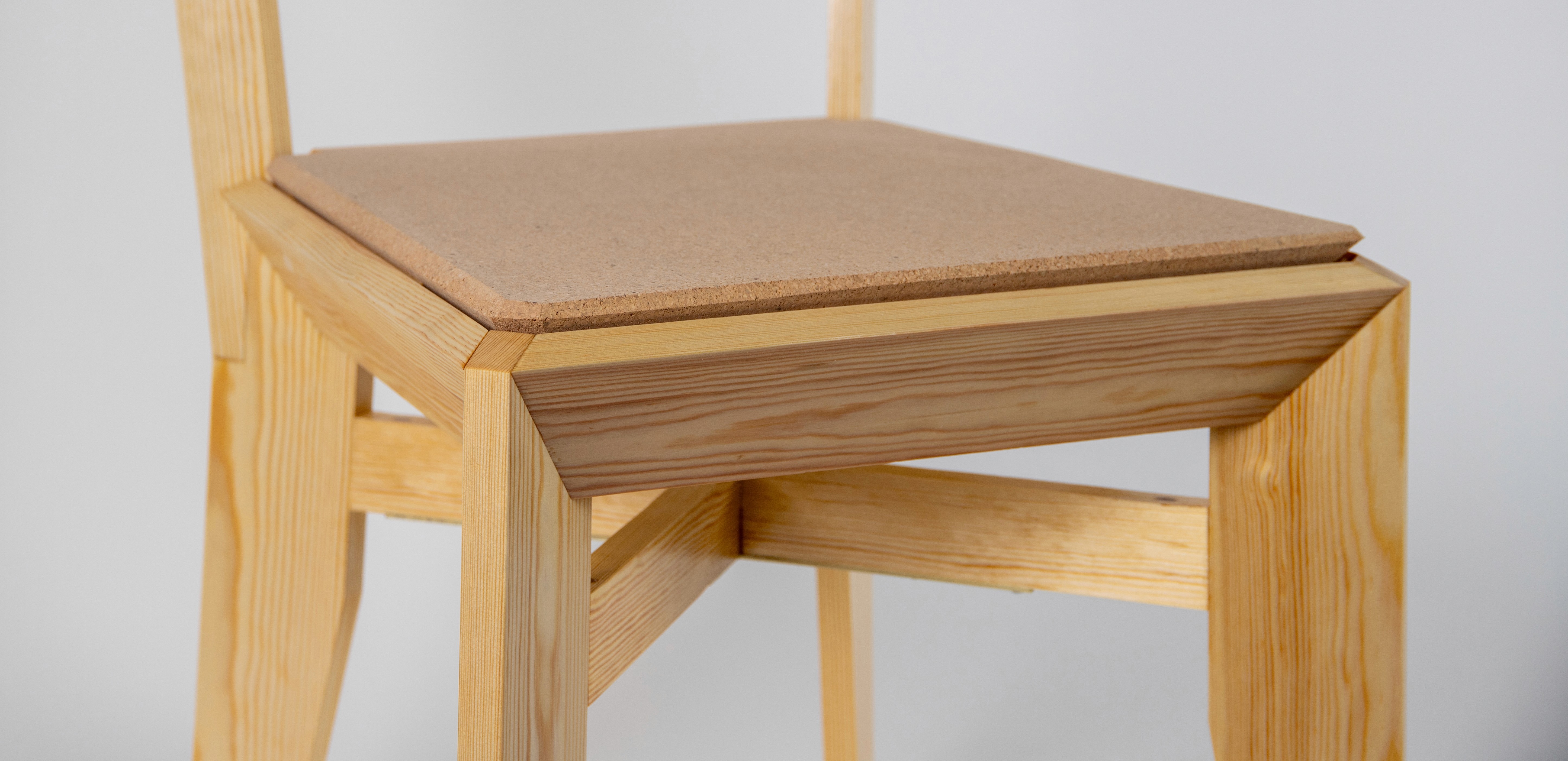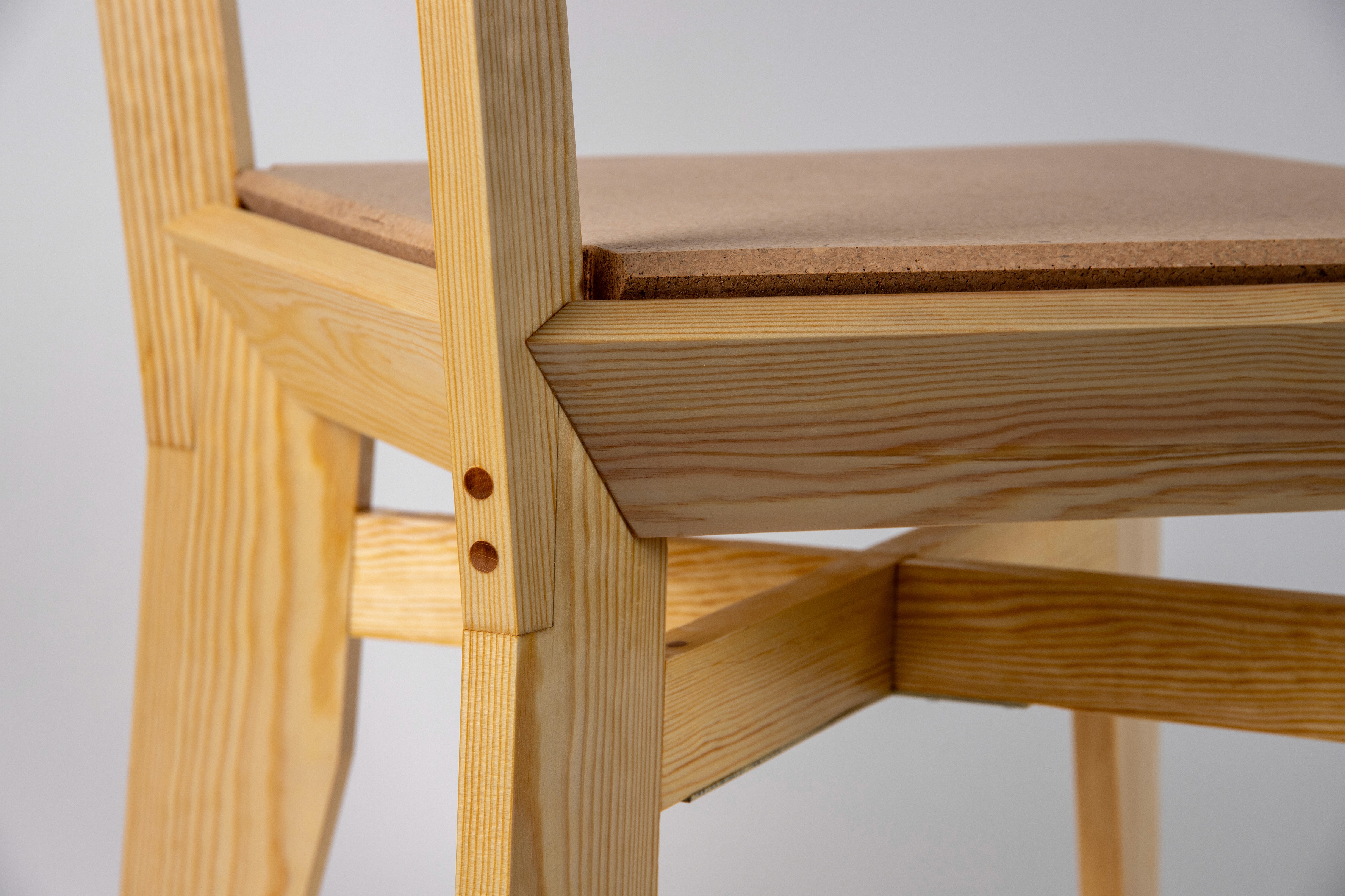 This dining chair combines locally sourced pine and endlessly recyclable cork to create a piece that balances sustainability and thoughtful design. Pine was chosen for its availability and natural warmth, though its softness required innovative reinforcement with metal connectors to ensure durability.