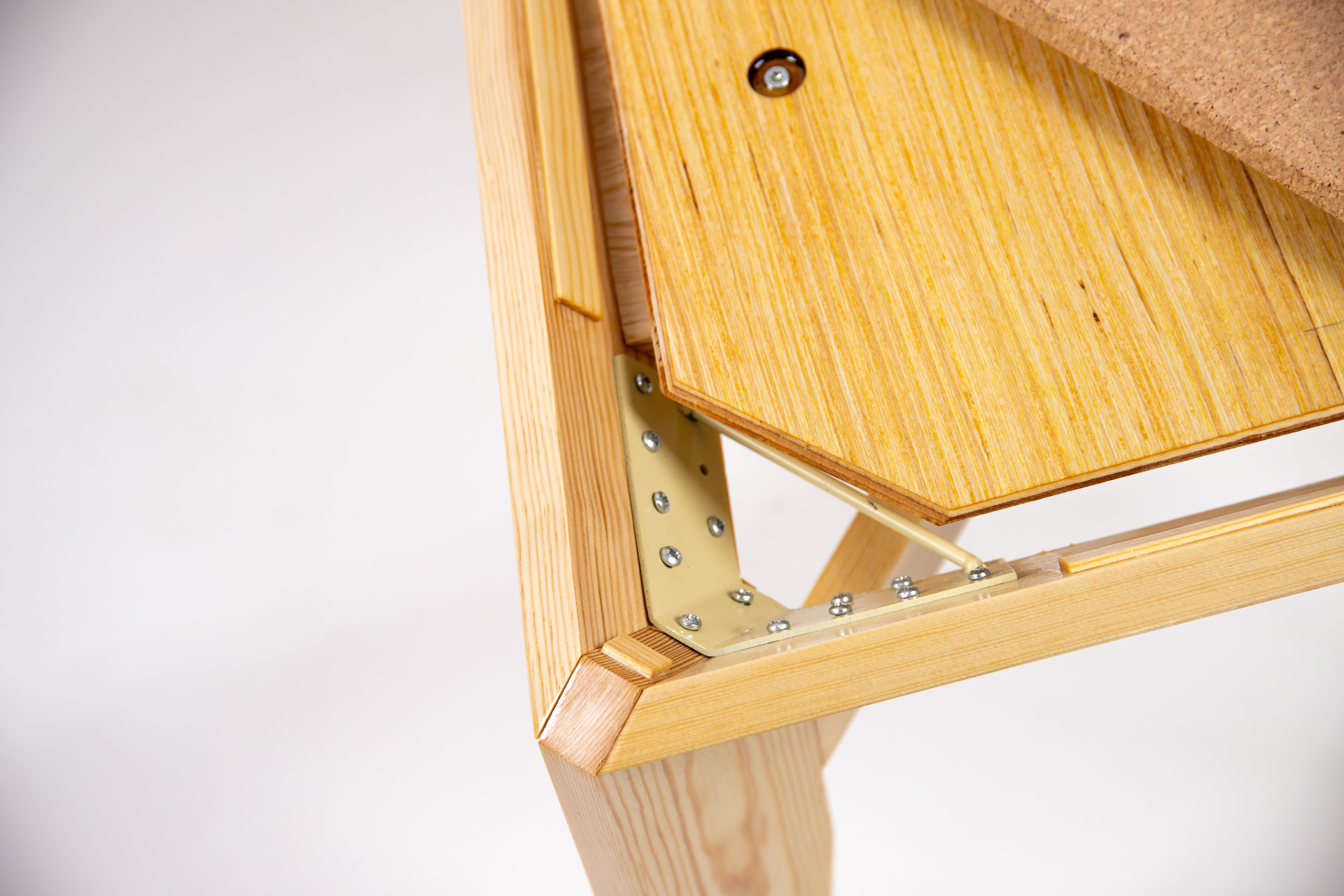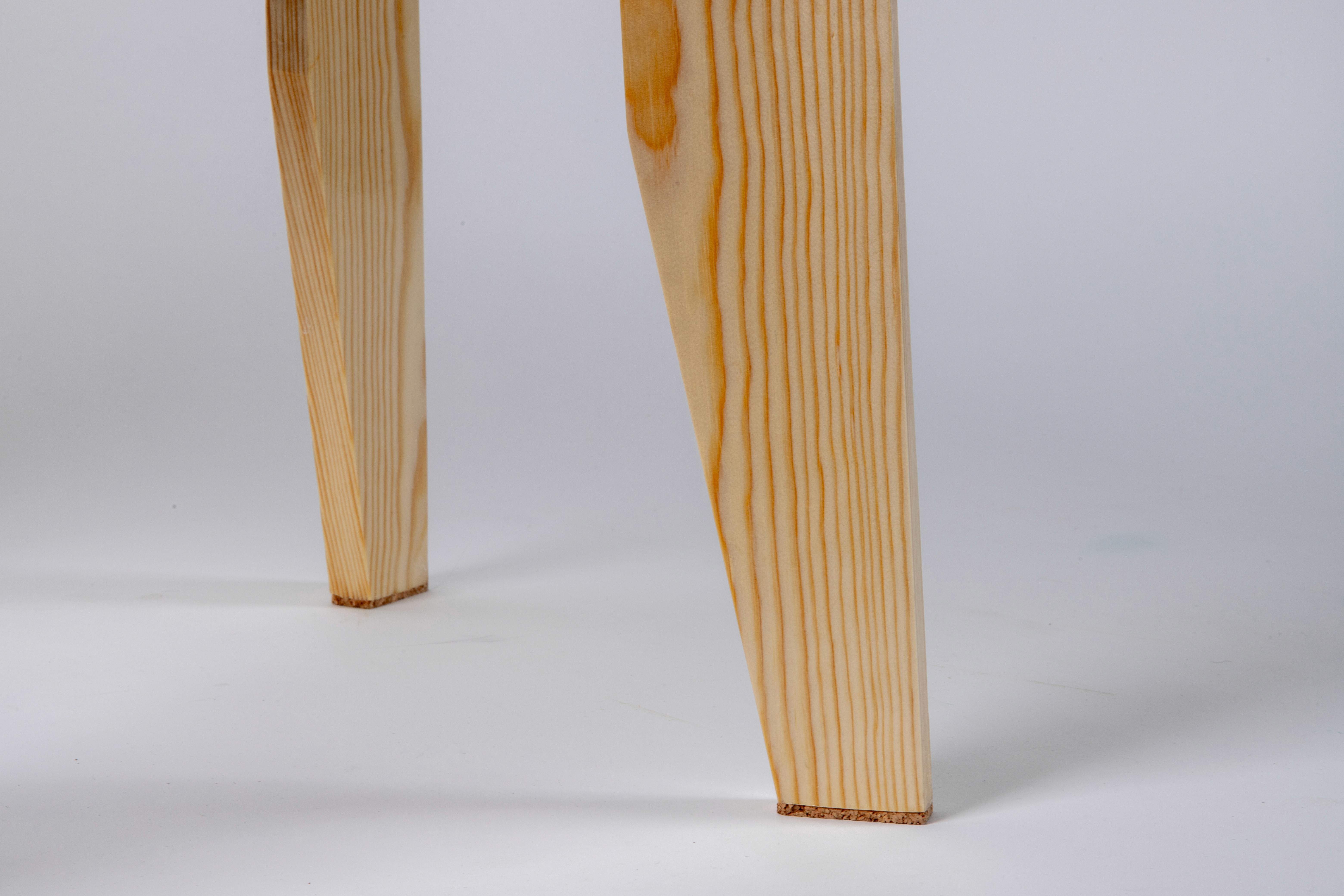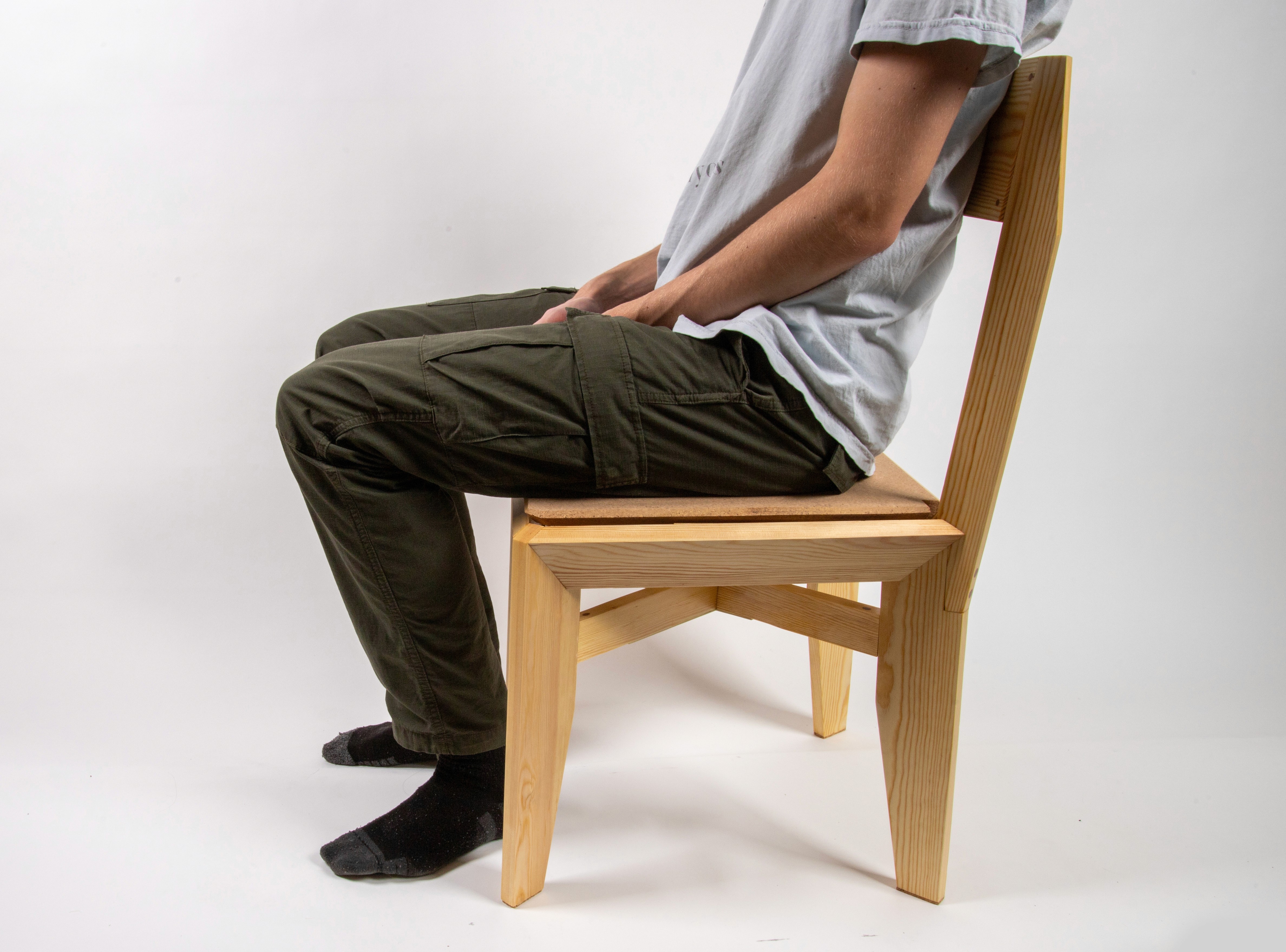 This dining chair combines locally sourced pine and endlessly recyclable cork to create a piece that balances sustainability and thoughtful design. Pine was chosen for its availability and natural warmth, though its softness required innovative reinforcement with metal connectors to ensure durability.